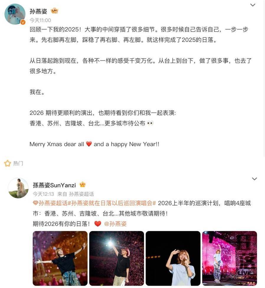 孙燕姿《就在日落以后巡回演唱会》2025年全面启动后,她今天(25日)发文回顾一下2025年,写下:“从日落起跑到现在,各种不一样的感受千变万化。从台上到台下,做了很多事,也去了很多地方。我在。 2026 期待更顺利的演出,也期待看到你们和我一起表演。“