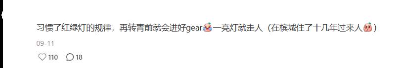 “习惯了红绿灯的规律,在转青前会进好gear,一亮灯就走人。”