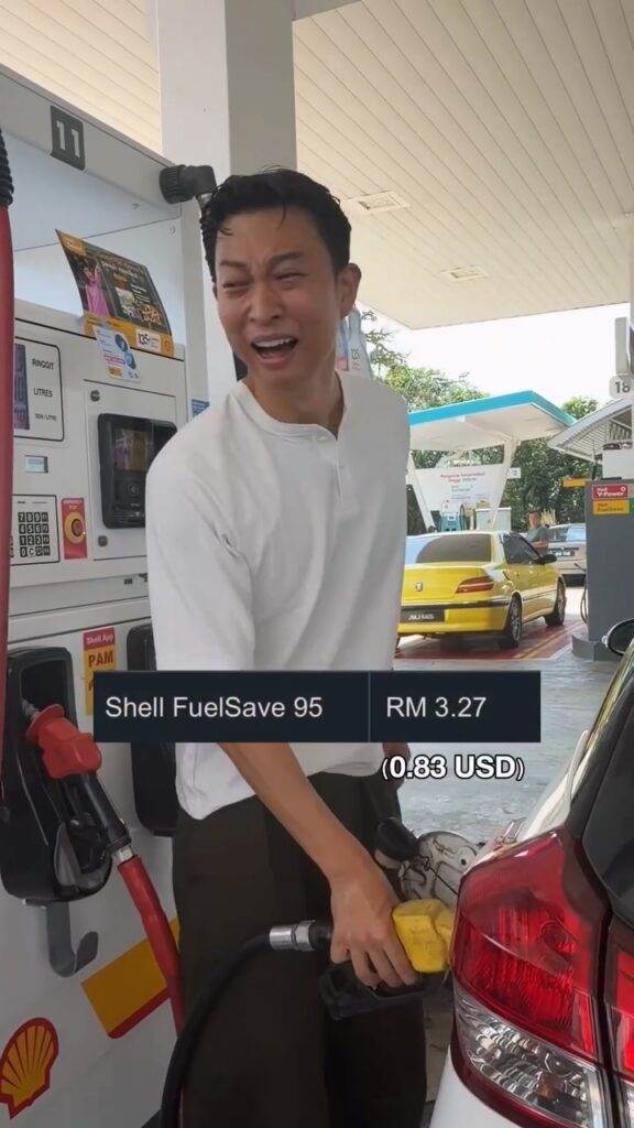 “托哥”日前在Instagram上载视频,画面中看到他在油站中给座驾添油。值得一提的事,“托哥”在视频上标明了RON95的价格为RM3.27(同等0.83美金)。视频上标明的RM3.27是未经政府补贴,供外国人添加的油价。