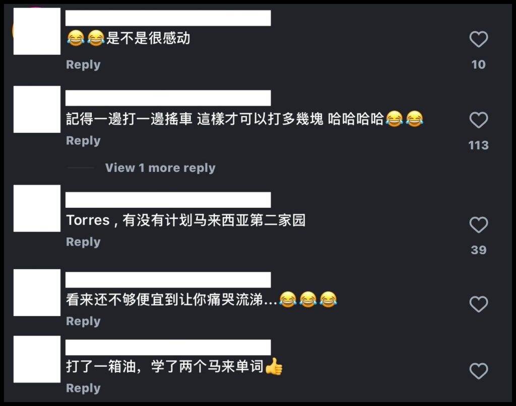 该贴文曝光后,立即引起一众大马网民热议,“是不是很感动”,有没有计划参与“马来西亚,我的第二家园”(MM2H)计划”、“记得一边打油一边摇车,这样才可以多大几块”、“打了一箱油,学了两个马来单词”、“看来还不够便宜到让你痛哭流涕”。