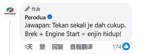 稍早,Perodua 在评论区公开答案,表示只要按一次就足够,即是踩刹车,然后按下启动按钮。