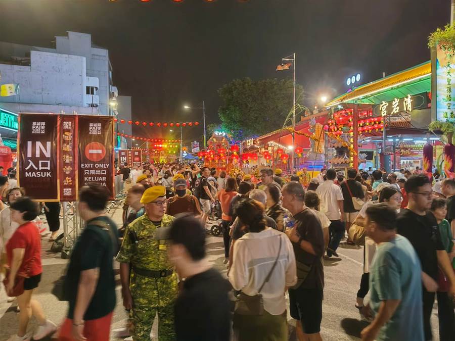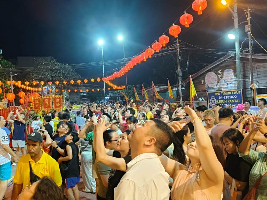 (槟城25日讯)槟城姓周桥拜天公盛典昨晚11时掀开序幕,现场锣鼓喧天、人潮汹涌,气氛热烈,但在致词进行期间,却突发烟花偏离方向射向舞台的小插曲,引发群众一度惊慌走避。