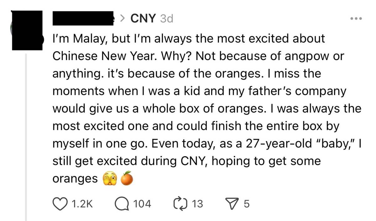 近日,一名马来女子在社交媒体 Threads 分享自己每年最期待的节日是华人农历新年,其原因不是红包,而是柑,引发网民热议。