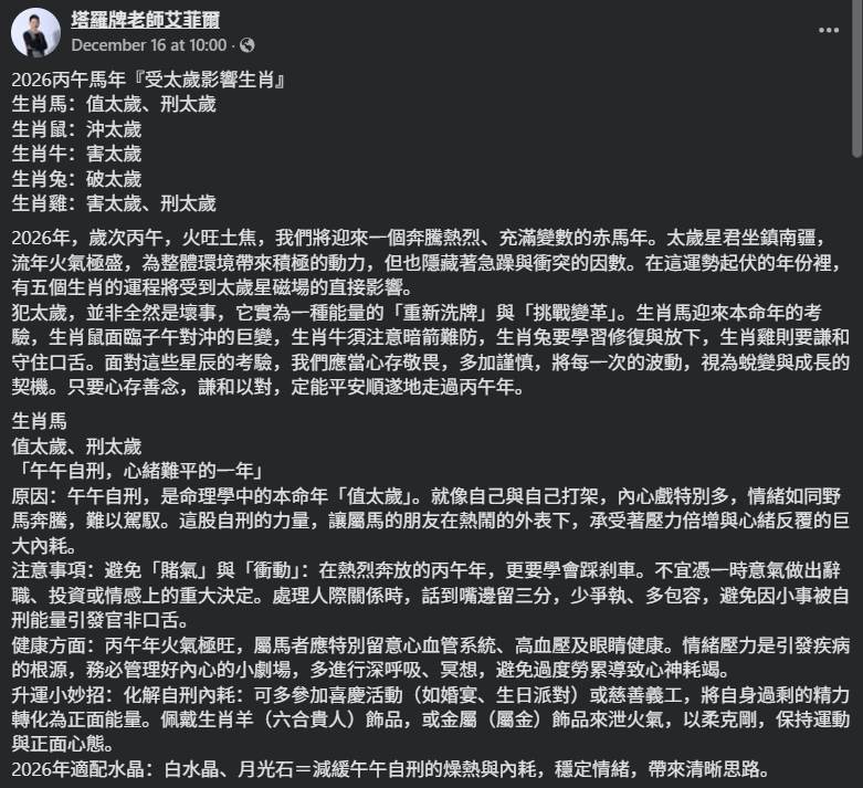 塔罗牌老师艾菲尔在面子书上发文透露,2026是丙午火马年,流年火气旺盛,将为整体环境带来积极动力,但也藏着急躁变数!此外,艾菲尔也透露,2026有5个生肖的运程将受到太岁星磁场的直接影响。
