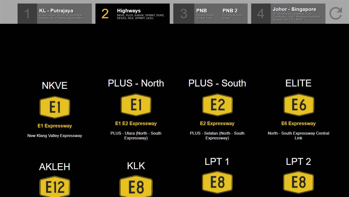 Jalanow 可以看到 29 条高速公路:吉隆坡到布城、南北大道,以及新柔长堤(Johor-Singapore)的实时路况!必须注意的是,目前巴生谷地区的 CCTV 正处于关闭情况。