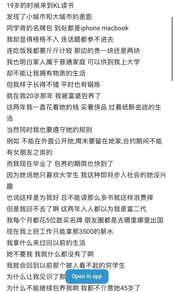 如果没有了富婆,男子只能每个月拿着RM3,500的薪水,回去当以前那种被很多人看不起的穷学生。