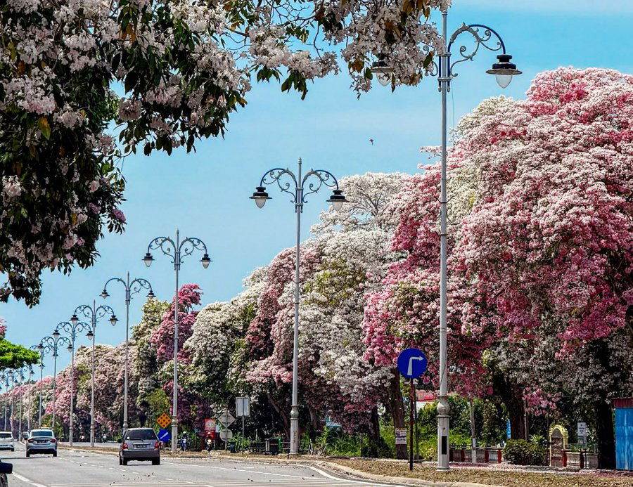 被誉为大马樱花的风铃木(Tabebuia rosea),近日在市中心一带盛放,尤其吉打港口路沿线景致最为壮观,花雨纷飞、满树灿烂的景象,宛如日本樱花季般浪漫,吸引不少民众驻足拍照打卡,成为社交媒体上的热门画面。