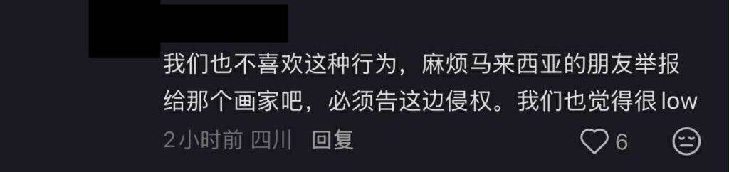 “我们也不喜欢这种行为,麻烦马来西亚的朋友举报给那个画家吧,必须告这边侵权。我们也觉得很 Low。”