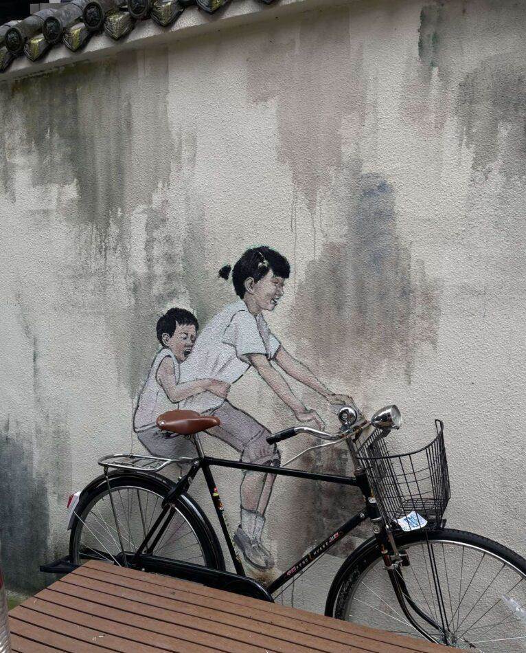 在槟城乔治市的本头公巷(Lebuh Armenian)里,有一幅最广为人知、也最具代表性的作品,就是立陶宛画家尔纳斯(Ernest Zacharevic)创作的《姐弟共骑》。这幅壁画描绘一对姐弟骑着旧脚车的生动画面,洋溢着童年的纯真与欢乐,如今已成为槟城乔治市最具标志性的艺术地标之一,吸引无数游客驻足拍照打卡。