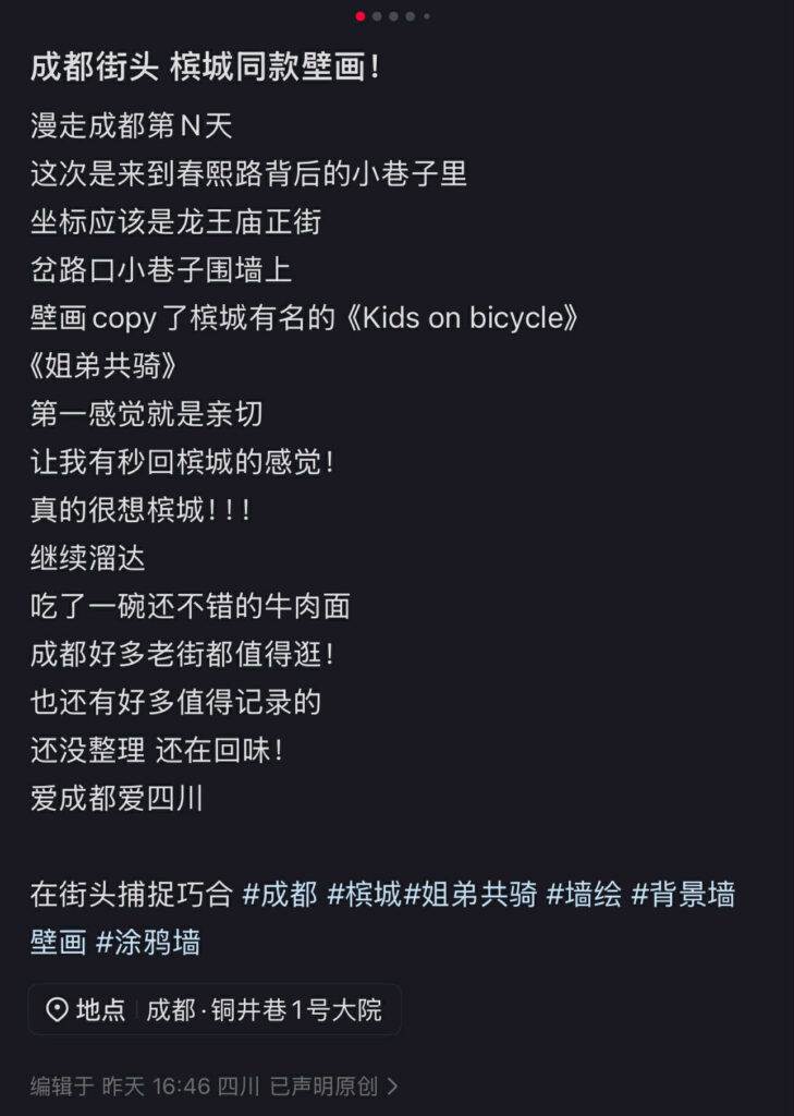 不过,近期却有游戏发现该壁画已被“拷贝”至中国成都?!有网友近日在社交媒体平台发帖,指在成都春熙路后面的小巷围墙上发现了槟城有名的《姐弟共骑》壁画,让她有种秒回槟城的感觉。