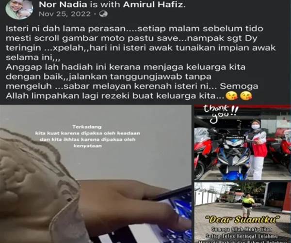 有网民找到死者阿米鲁遗孀诺娜蒂雅于2022年11月在面子书发布的贴文,诺娜蒂雅在该贴文说,每次睡觉前都看到丈夫拿着手机偷偷浏览卖摩哆的网站,看到心仪的摩哆价格昂贵不舍得买,最终只是点赞收藏。