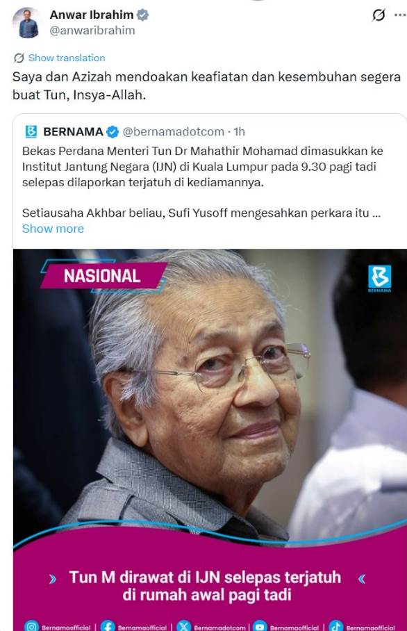 前首相敦马哈迪周二上午在家中跌倒,送往国家心脏中心治疗;首相拿督斯里安华周二在社交媒体为他祈福。