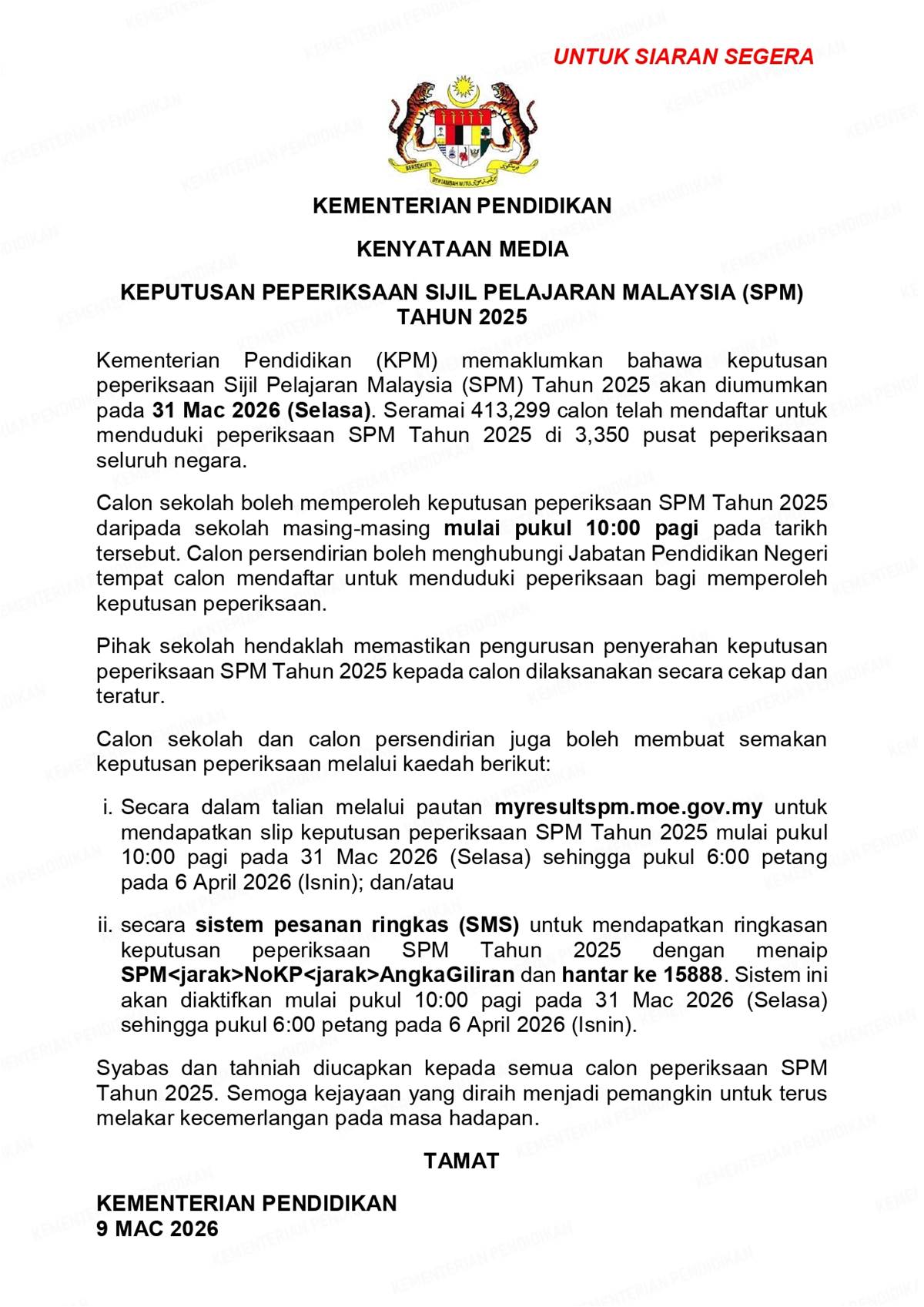 SPM 考生期待已久的放榜日期终于来了!教育部于 3 月 9 日(星期一)发布声明指出,2025 年马来西亚教育文凭考试(SPM)成绩将于 3 月 31 日(星期二)正式公布!届时,考生可通过以下 3 种方式查询成绩。