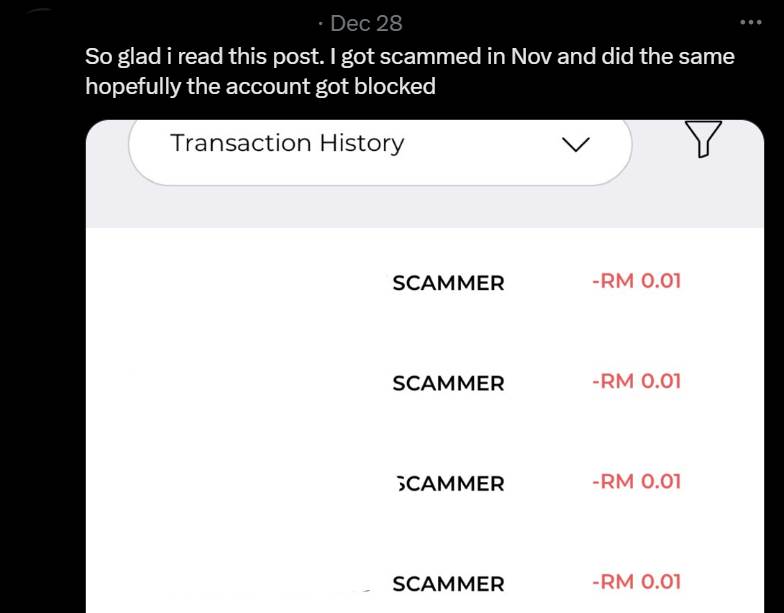 “很开心看到这个贴文,我在11月也被骗了,希望可以让这个户口被冻结。”