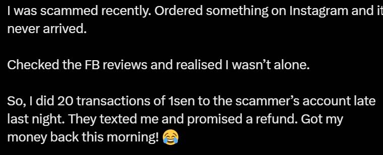 一名大马女子最近在网购时遇到了诈骗,了解情况后发现自己并不是唯一的受害者。于是,她狂转账给这名骗子,还在支付详情中写上“Scammer”(骗子),直接吓到对方马上联系她并答应全额退款!