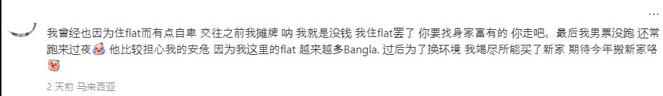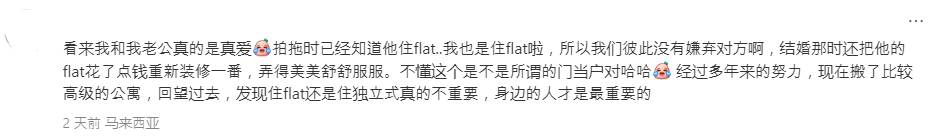 对此,有大马网友表示住在Flat的人大多都是有钱人,也有人分享了自己住在Flat仍能寻得真爱的故事。