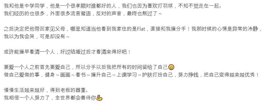 根据这名女子的贴文,她透露自己跟男友是中学同学,两人因为喜欢打羽球,不知不觉走在一起。她表示,男友是一个很孝顺且对谁都好的人,两人在一起后也经历很多流言蜚语和反对的声音。