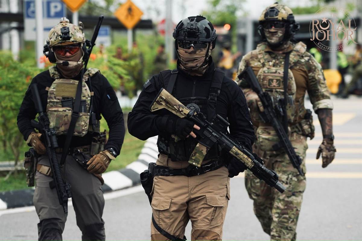 大批荷枪实弹的特种部队及柔州御林军模拟火车站遭遇恐怖分子挟持人质的演习。(图取自柔佛王室面子书)