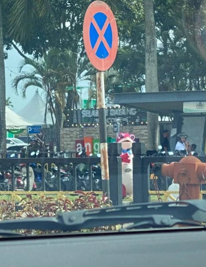 青蛙玩偶身高不及男子,相信装扮者是未成年。