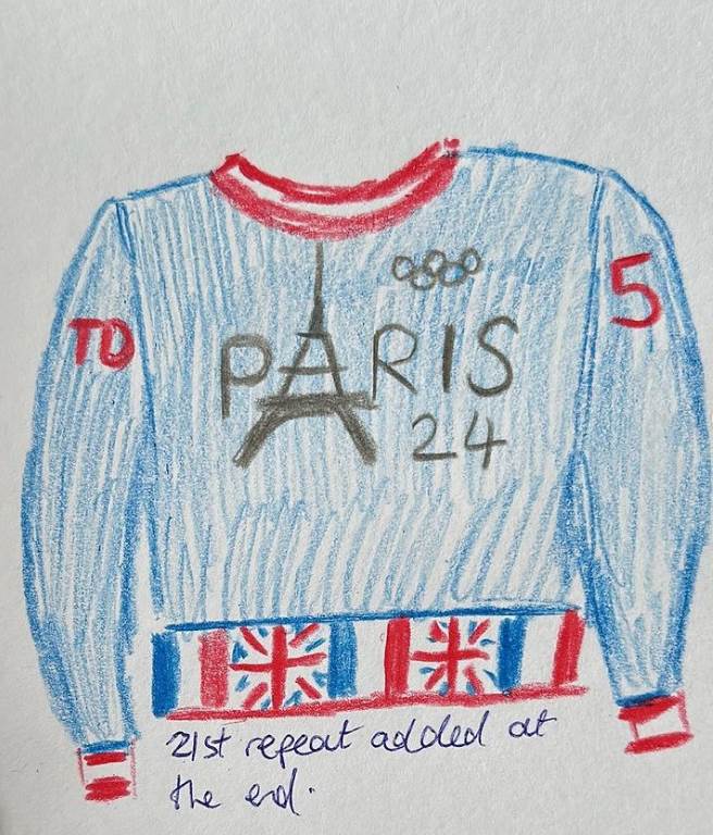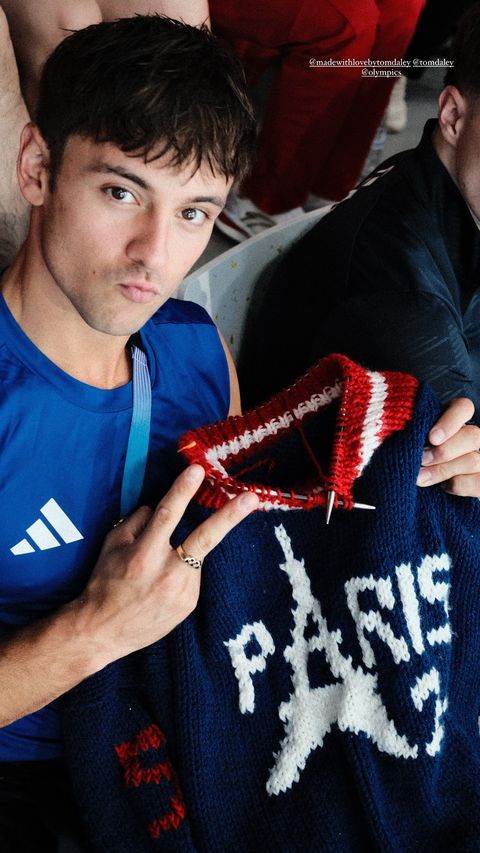 照片随后引起了网民热议和转发,Tom Daley也转发了照片,还秀出成品图,向粉丝们展示了他亲手编织的蓝白红巴黎奥运毛衣。