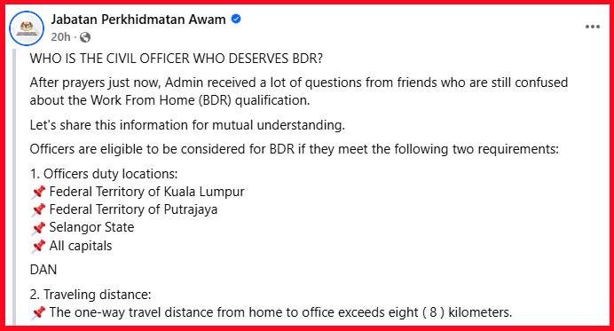 根据公共服务局(Jabatan Perkhidmatan Awam)在 Facebook 发布的公告,公务员若要被考虑安排居家办公(BDR),需要同时符合以下 2 项条件: