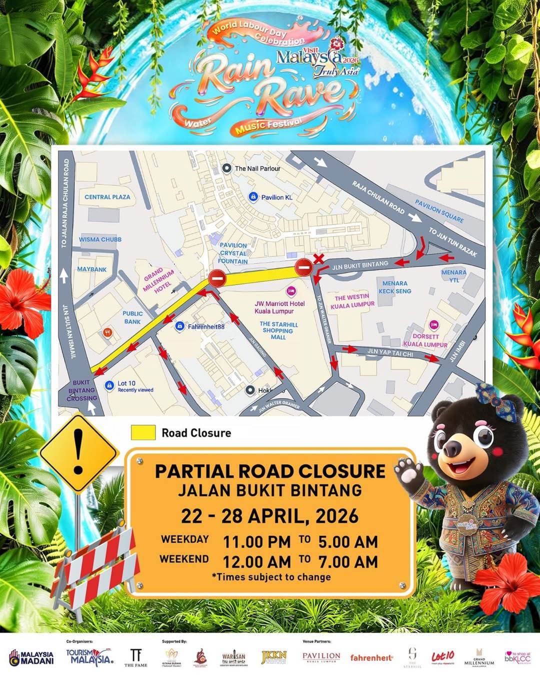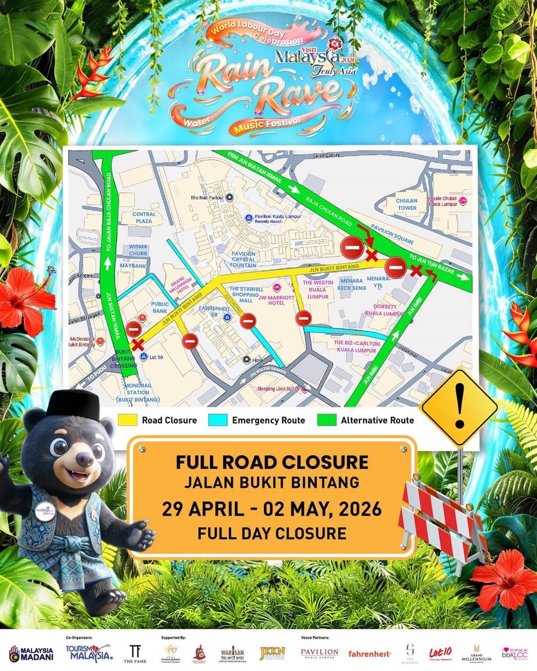 配合 2026 年世界劳动节庆典及 Rain Rave 水上音乐节,从 4 月 22 日起,吉隆坡金三角地段 —— 武吉免登(Bukit Bintang)将分阶段实施道路封闭措施。