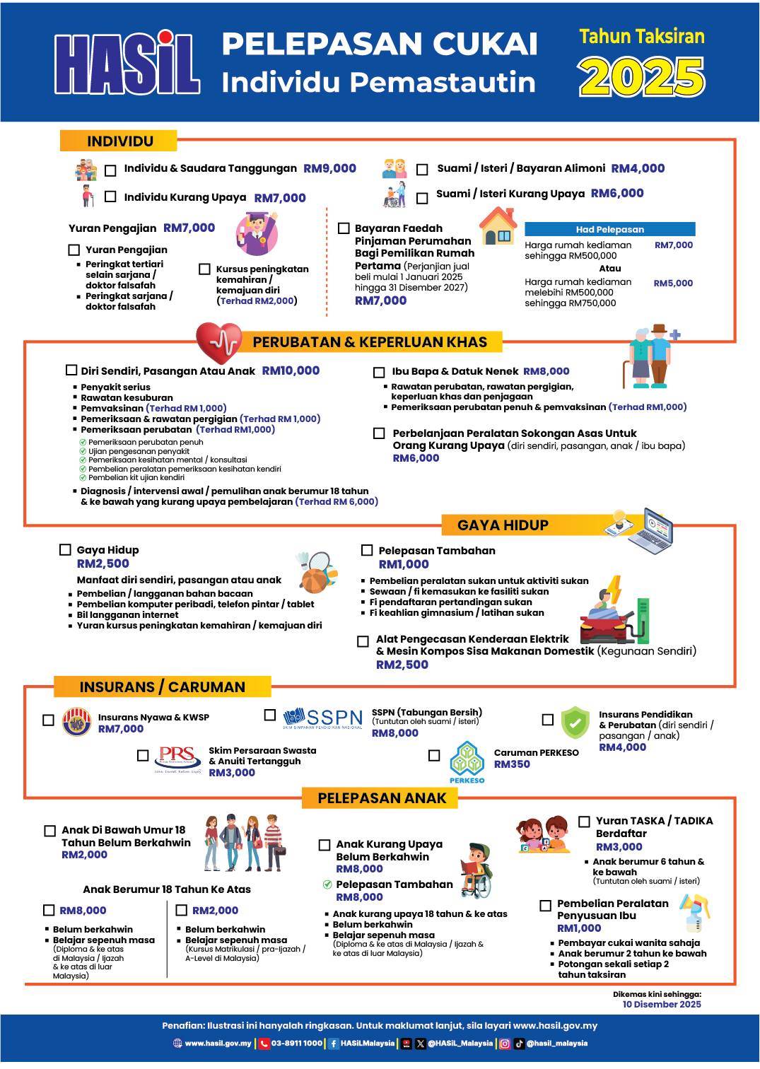 大马内陆税务局(LHDNM)公布了 2025 课税年度个人所得税减免清单!