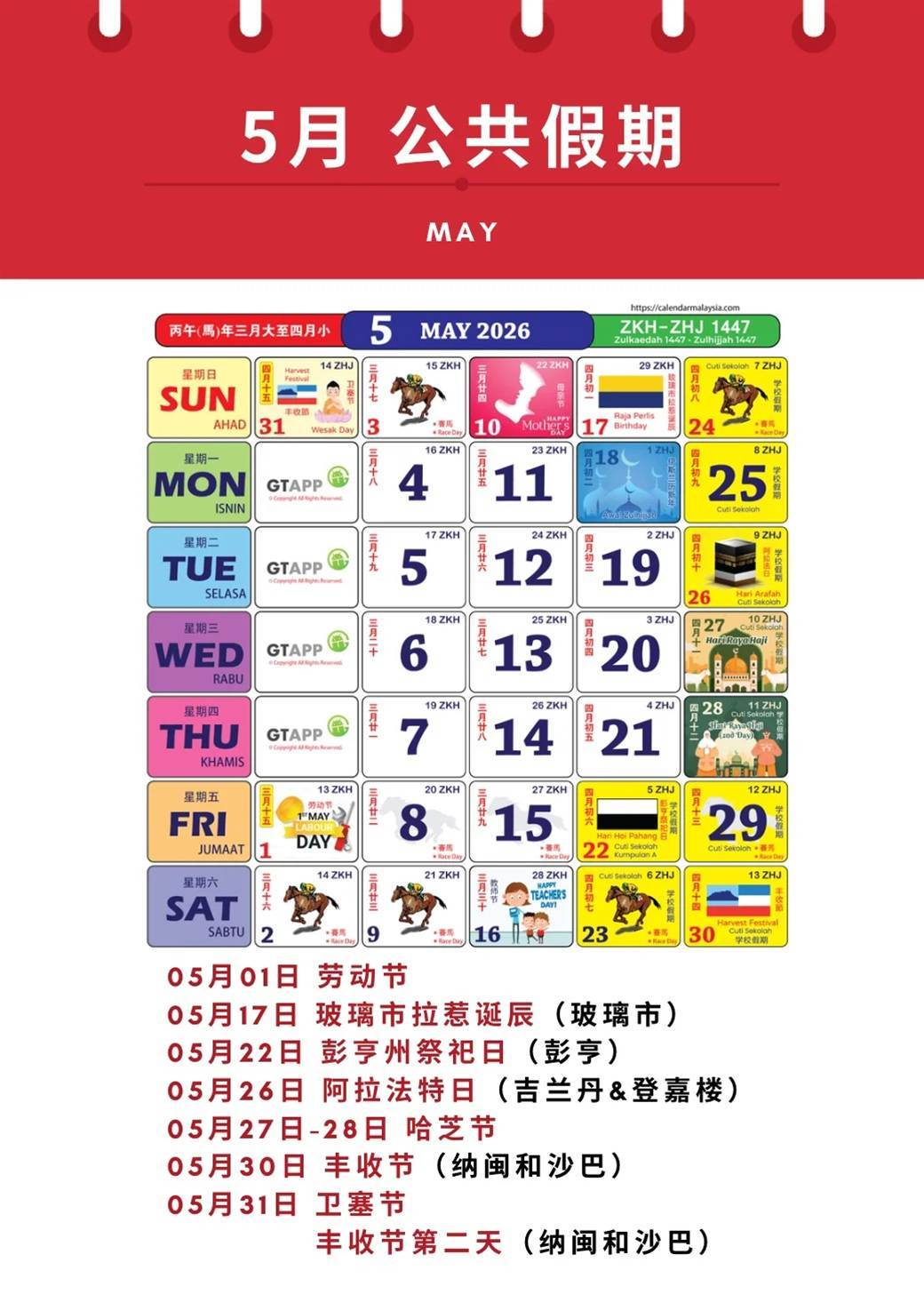 除了月初这轮长周末,5月底的假期同样密集。官方资料显示,哈芝节定于5月27日星期三,卫塞节则落在5月31日星期日,显示5月下旬仍有多天公假接连出现。