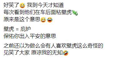 另外,有网友透露另一个说法是“马路如虎口”,所以在车尾贴上壁虎有着“避虎”的意思。