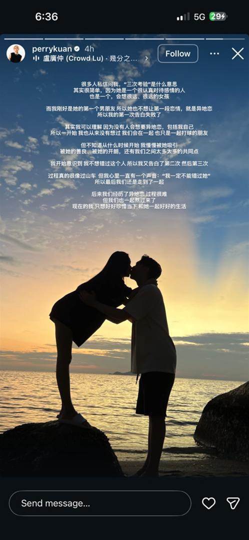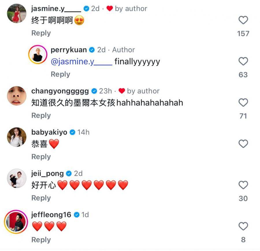 除了官宣影片之外,Perry Kuan 与 Jia Yi 也分别表达了各自的心声。随后,两人还在 IG Story 中陆续分享了多段从未曝光的片段,其中不乏异地恋期间的甜蜜回忆。在最新更新的动态里,Perry 更透露,自己曾经历三次告白,最终才成功打动对方,修成正果。