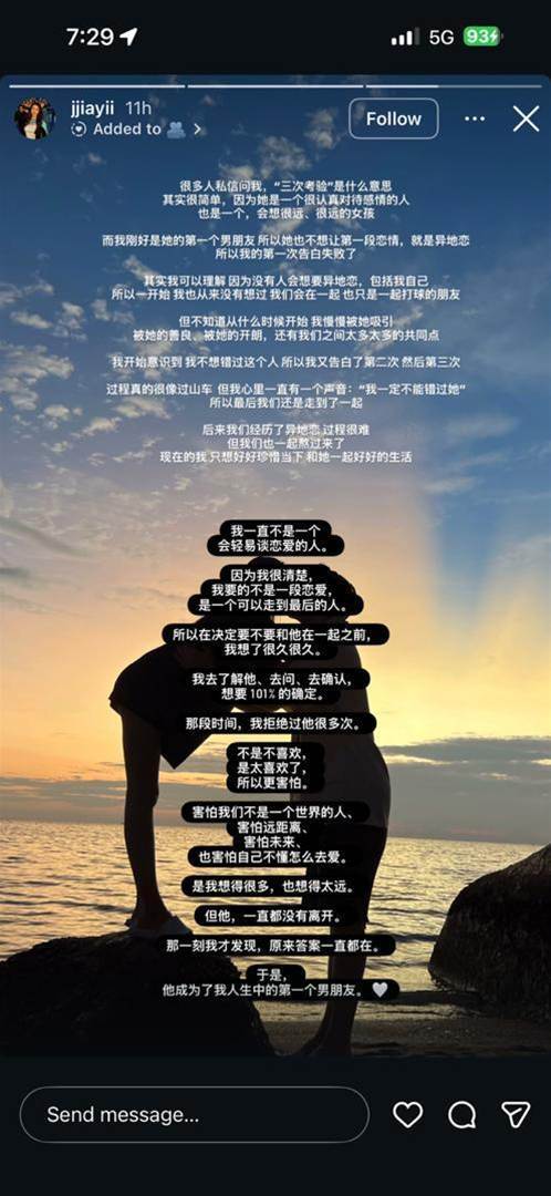 事后,Jia Yi 也转发了男友的动态,并分享了自己当时的想法。她表示,自己追求的从来不只是谈一段恋爱,而是一个可以携手走到最后的人。因此,在真正开始之前,她花时间去观察与确认,也曾多次婉拒对方,但对方始终没有放弃,这段关系也就这样一路坚持,陪伴彼此走过了四年的时光。