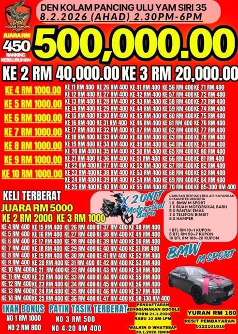 主办单位在赛后透露,这场赛事已成功掀起全民垂钓热潮。为了趁热打铁,下一场比赛已定于3月1日举行,届时冠军奖金将更上一层楼,加码至惊人的100万令吉!消息一出,不少垂钓爱好者已摩拳擦掌,准备在下月一试身手,挑战成为下一位“百万钓手”。