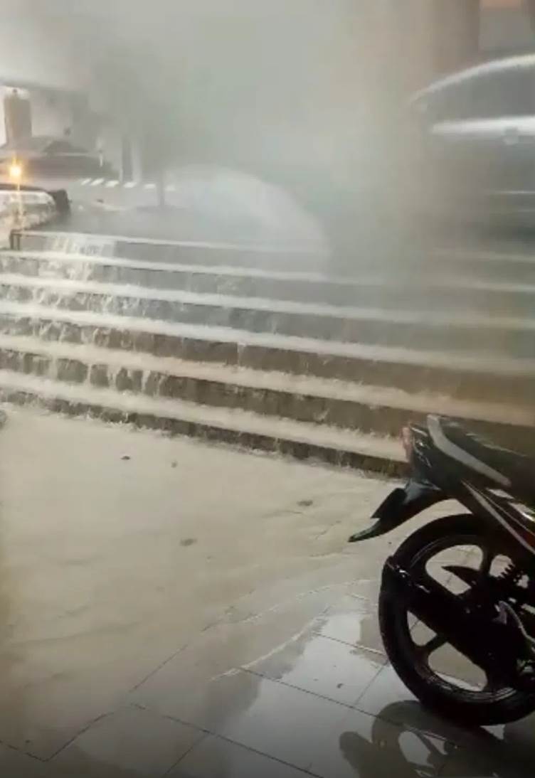 由于地势低洼加上排水设施不足,造成新山中央医院百合楼出现如小瀑布倾泻的闪电水灾。(图:林添顺面子书)