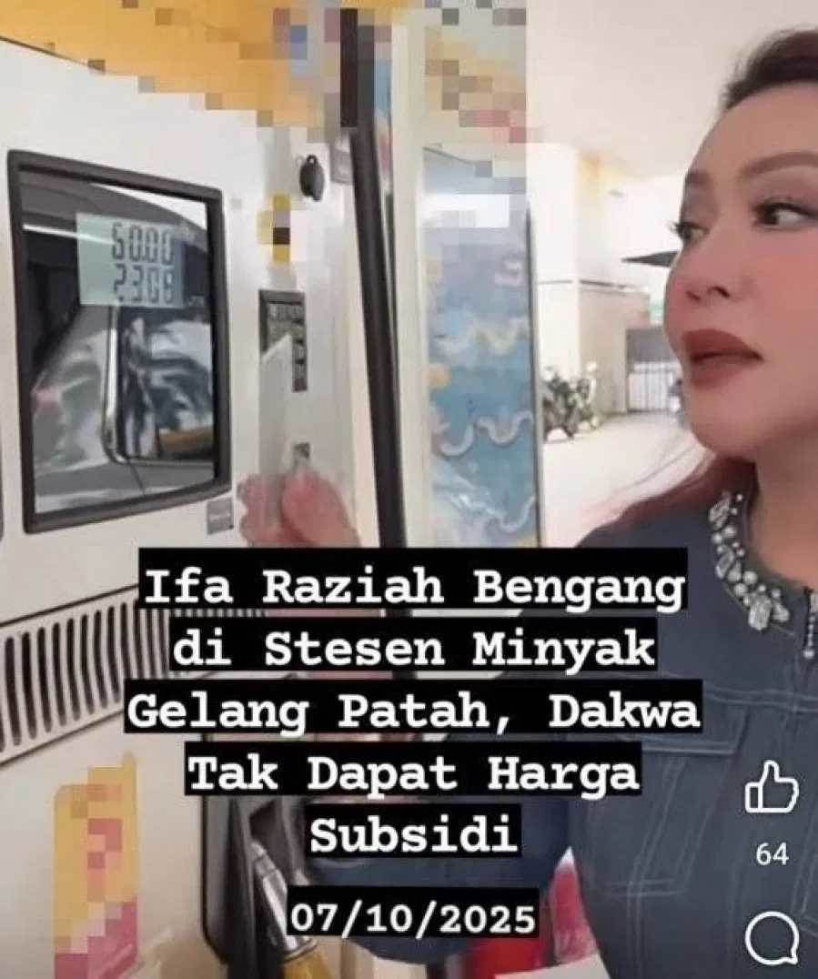 本地女艺人依法拉兹雅声称,昨日在振林山一家油站使用大马卡添打RON95汽油时,却无法获得津贴汽油。