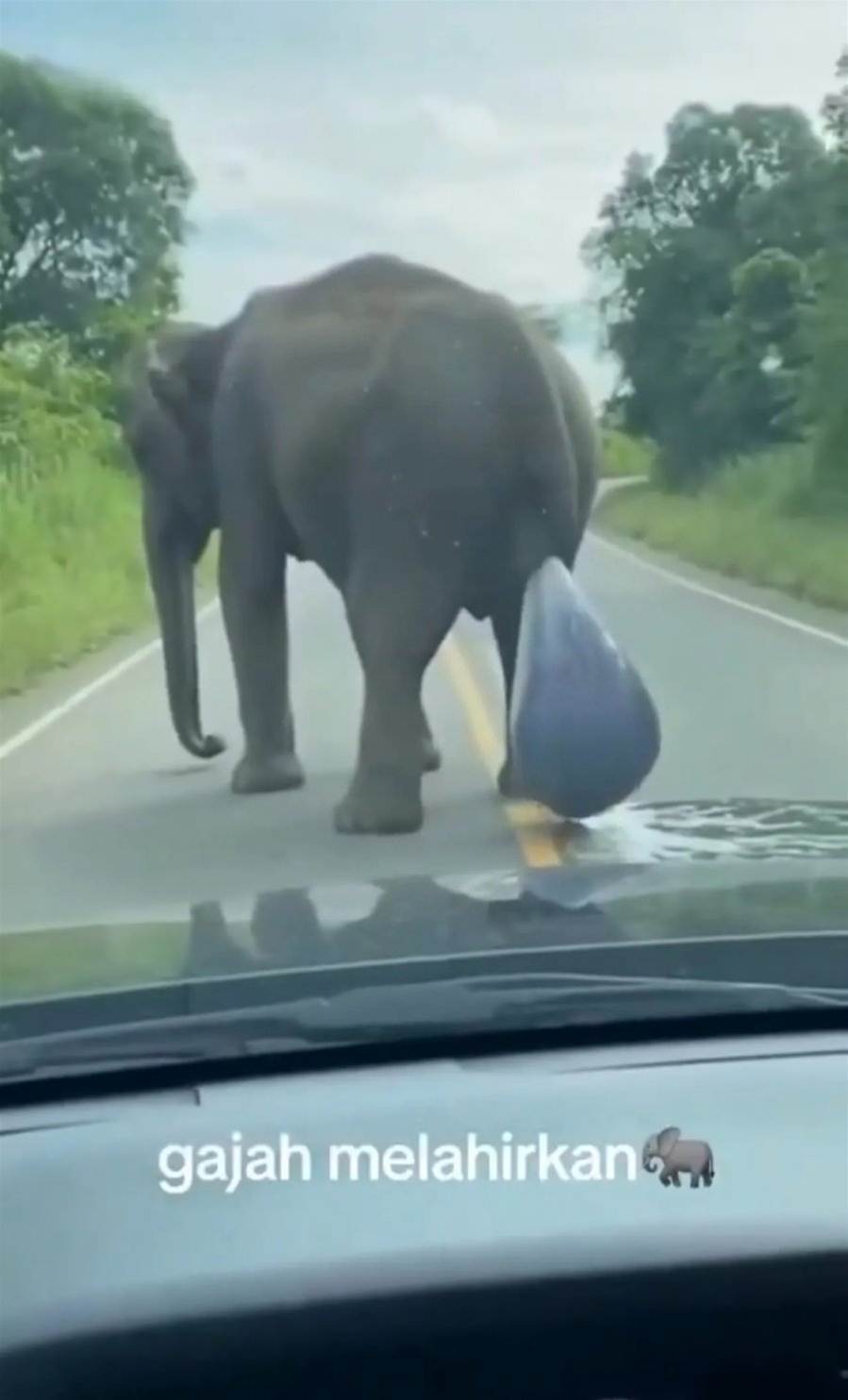 ,一头母象走在靠近森林的一条公路上,停在路中央,随后胎膜破裂,顺利诞下幼象。