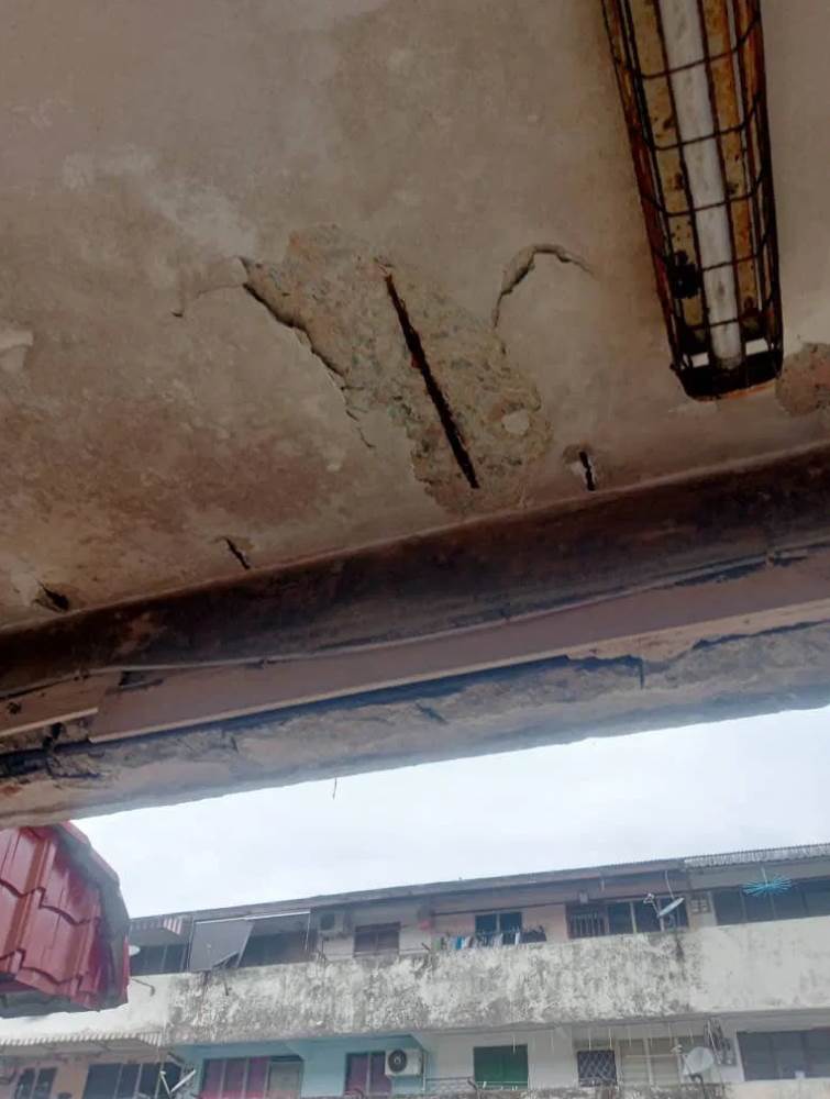 组屋部分钢筋外露,加上墙体龟裂及出现倾斜,让居民担忧安危。(图取自玛丽娜面子书)