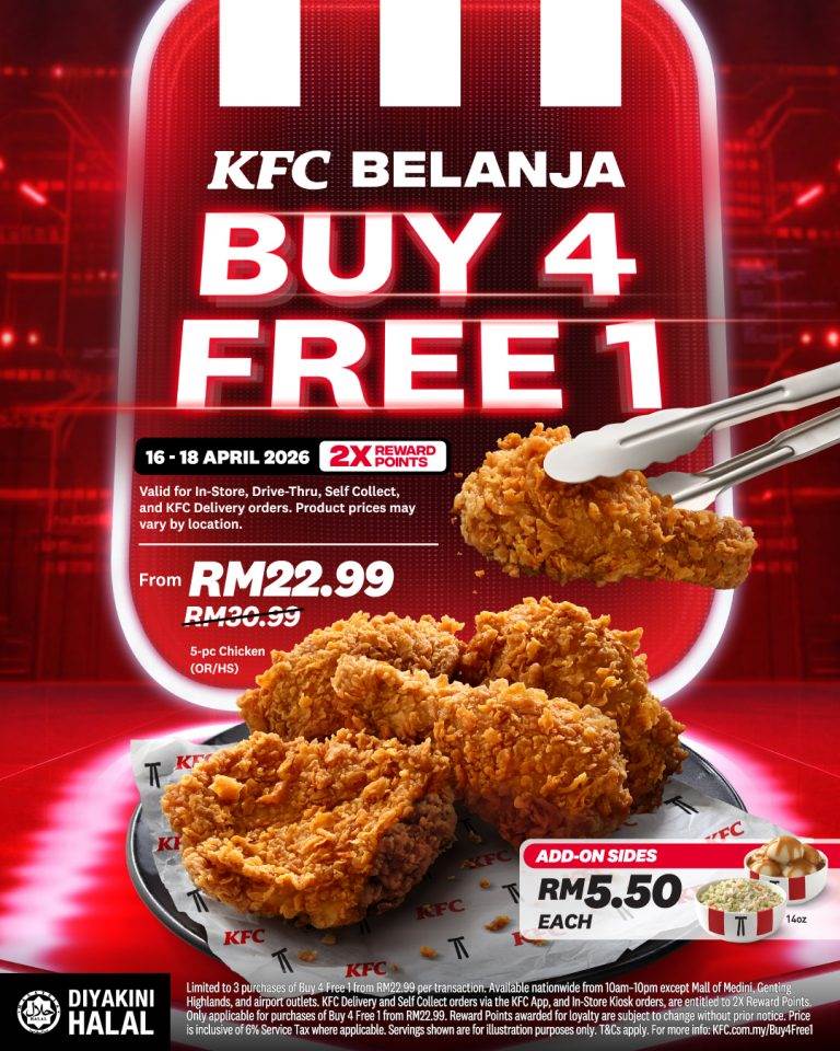 大马 KFC 超狂优惠又来咯,这次是【买四送一】,买四块炸鸡,就 Free 送你一块哦!总共 5 块香脆炸鸡(原味 / 辣味),连续 3 天只要 RM22.99!赶紧 Jio 人去实现炸鸡自由咯~~