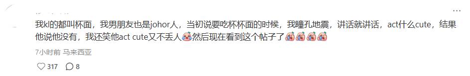 “我KL的都叫杯面,我男朋友是柔佛人,当初说要吃杯杯面的时候,我瞳孔地震。”