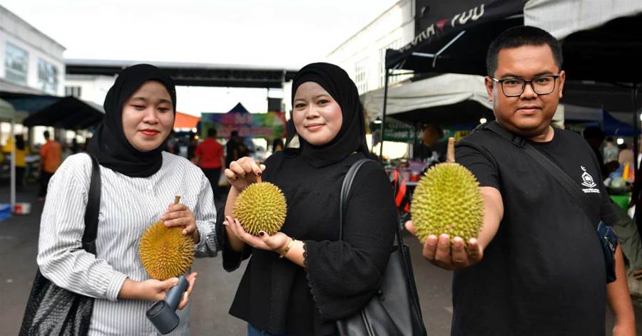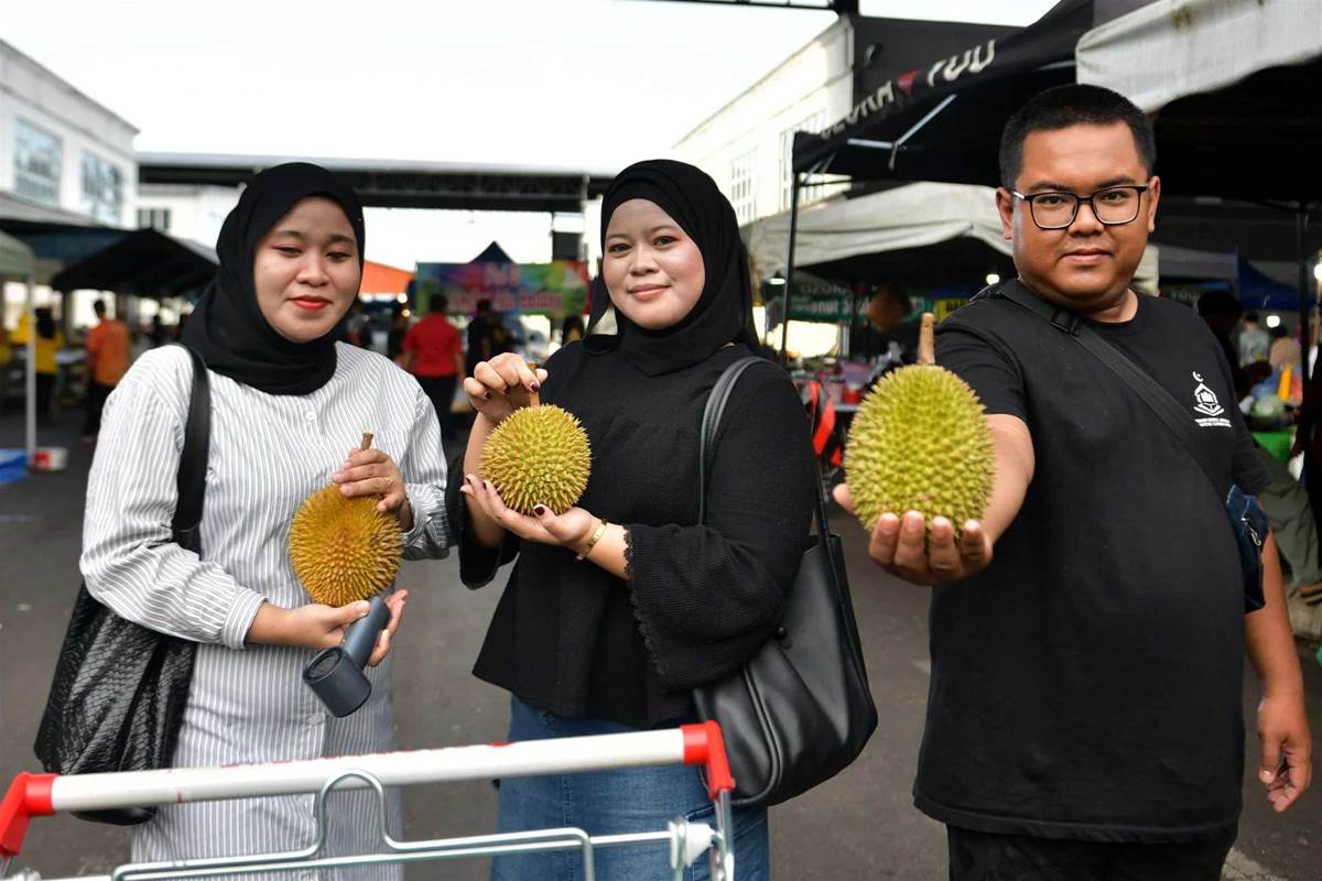 阿蒂卡莫妮和卡玛丽亚莫妮展示她们购买的促销榴梿,价格根据大小不同,每个榴梿低至1令吉。