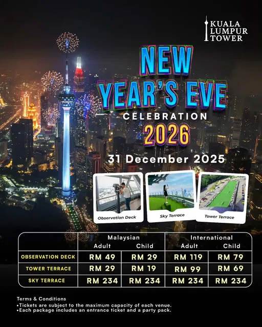 吉隆坡塔(KL Tower)同日举办跨年庆典,从约300公尺高空俯瞰城市景观及烟火秀。活动开放三个观景区域,部分票已售罄,仅剩少量塔楼露台门票可购。