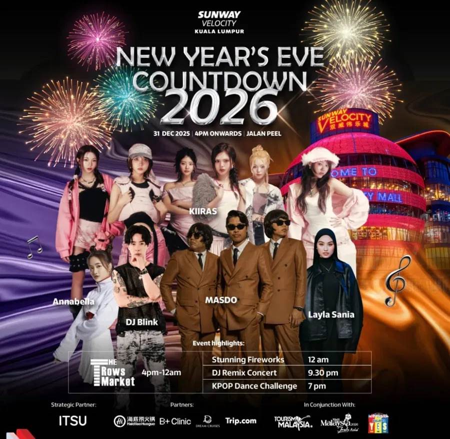 双威伟乐城(Sunway Velocity) 的跨年倒数演唱会从当日下午4时起演出不断,还有市集、舞蹈挑战、DJ表演及夜晚烟火。