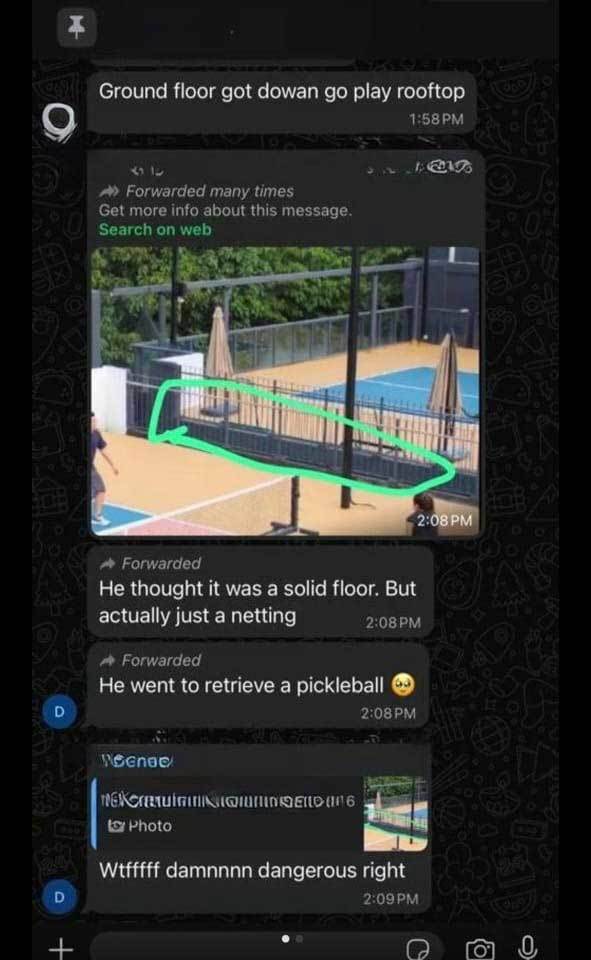 旺沙玛朱警区主任莫哈末拉津助理总监今日发文告证实,这起悲剧发生于昨晚9时43分。事发时,该名华裔男子正在3楼匹克球场参与活动,期间其匹克球不慎掉落至隔壁球场区域,为找回球他选择攀越球场间的围栏,过程中发生意外坠楼事故,最终不幸身亡。