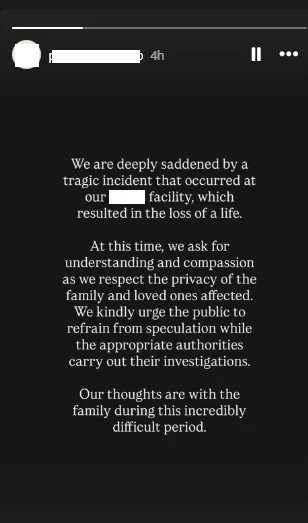 事故发生后,涉事匹克球场负责人第一时间在Instagram发布限时动态,对这宗造成人员丧命的悲剧表达了深切悲痛。负责人在动态中表示,恳请大众在相关单位展开调查期间给予理解与同情,切勿妄加猜测,同时会严格尊重逝者家属及亲友的隐私,“在这个无比艰难的时刻,我们与家属同在”。