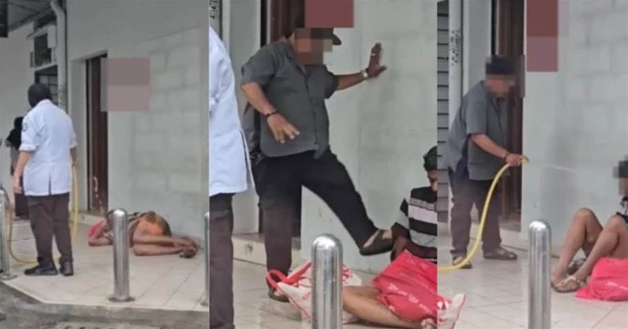 马来西亚一名银行女保安员为了驱赶坐在银行旁走道的流浪汉,竟用水管朝着流浪汉射水,后来再有一名男子加入,脚踢流浪汉及继续射水,引起网民强烈批评做法太残忍。