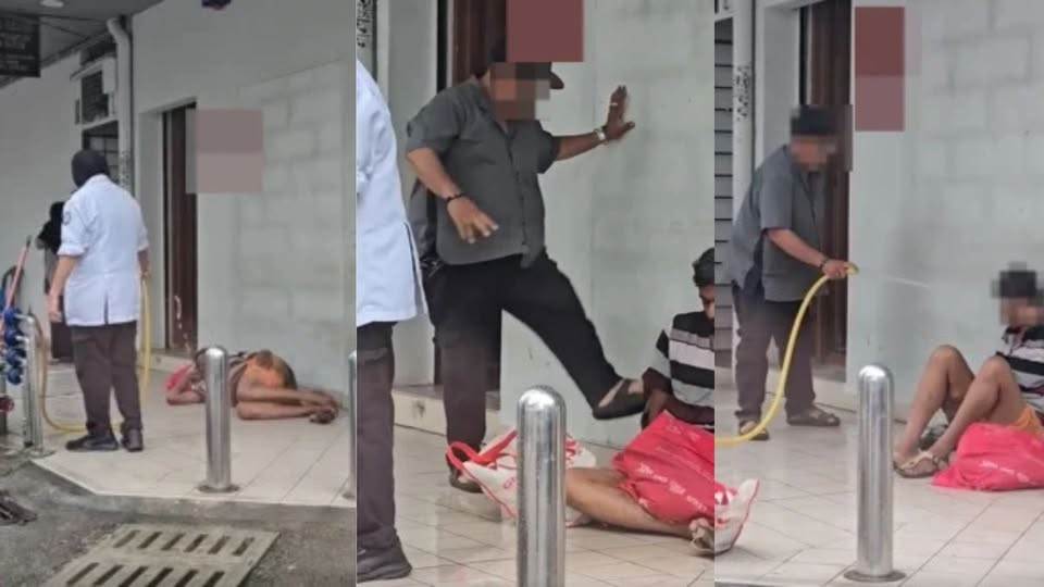 据报道,社媒平台近日广传一则视频,可见一名男性流浪汉躺在商店旁的走道,一名女保安员打开一旁的水龙头,用水管朝流浪汉射水,还挥手疑似驱赶对方。不久后,一名戴眼镜男子走过来,用脚踢了流浪汉的背部,随后他看见流浪汉不肯离开,便用水管继续对着流浪汉喷水。
