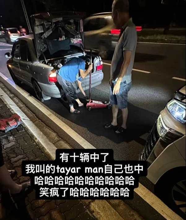 其中一名贴主分享自身遭遇指出,车辆爆胎后紧急召来轮胎师傅前来救援,岂料师傅抵达后也同样“中招”,令人哭笑不得。