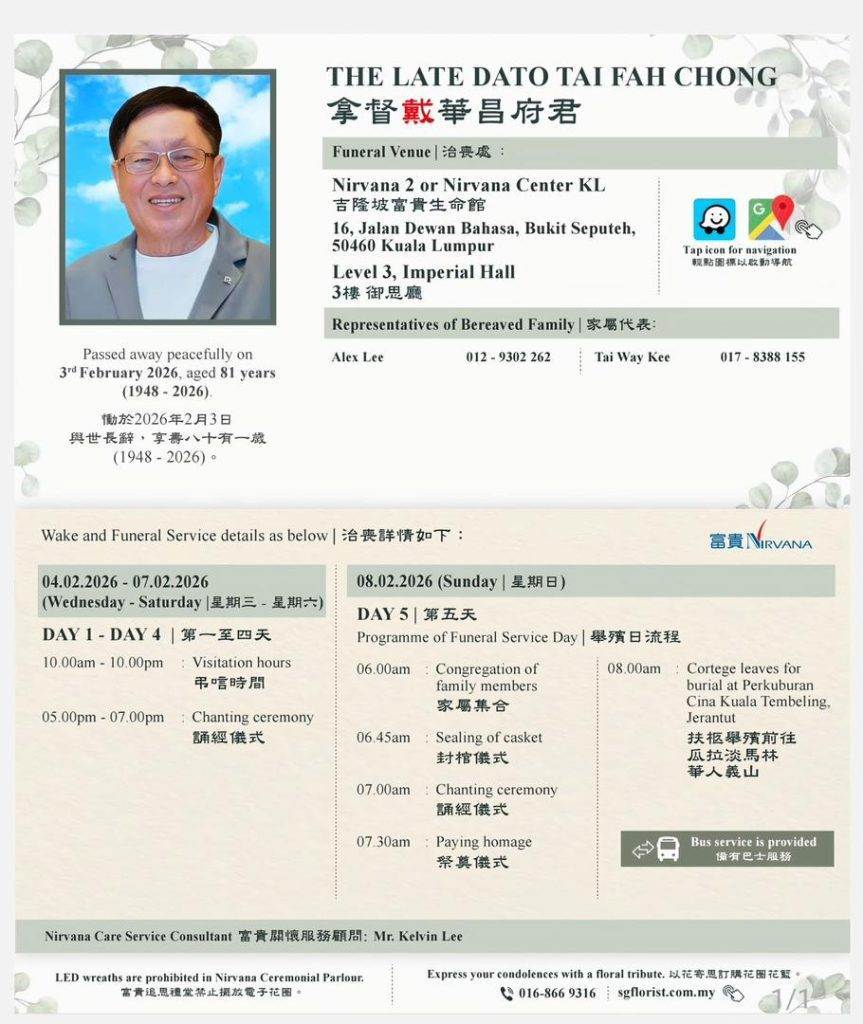 根据《中国报》报导,家属发布的讣告,戴华昌的灵堂将设于吉隆坡富贵生命馆,供亲友凭吊的时间为2月4日至7日。遗体将于8日举殡,随后安葬于瓜拉淡马林华人义山。