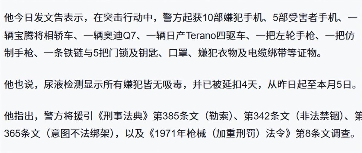 现在这些嫌犯已经被警方按勒索、非法囚禁、意图不法绑架被拘留。