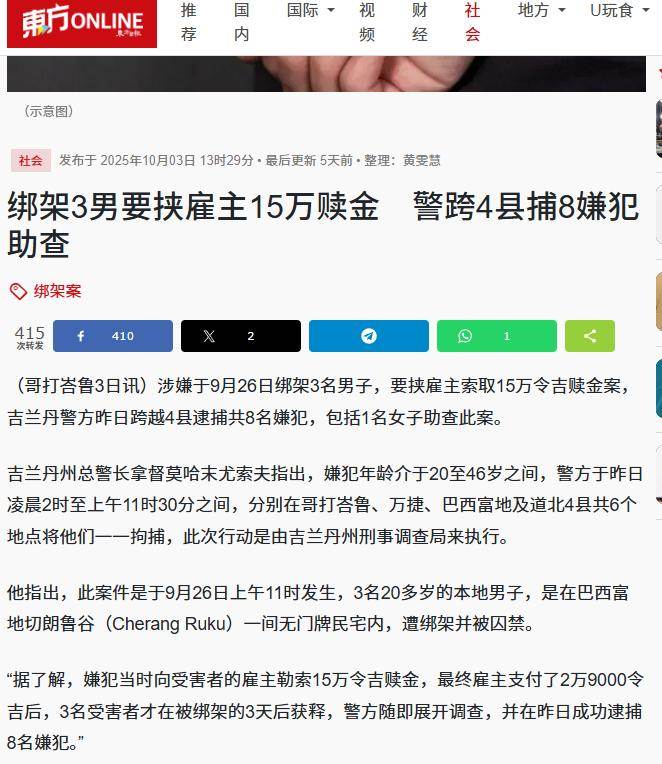 绑匪一张嘴,就向小伙子的雇主要15万令吉赎金(大约25万人民币)。