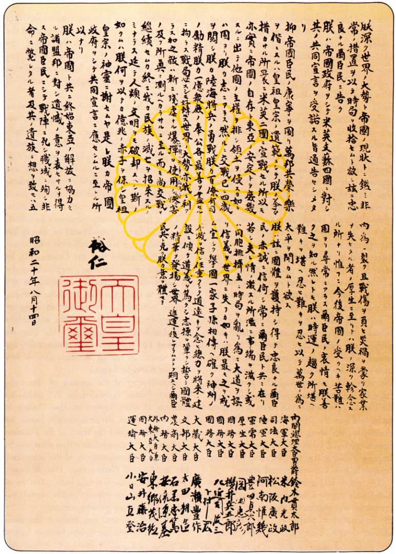 1945年8月15日,日本昭和天皇宣读《终战诏书》,宣布无条件投降。